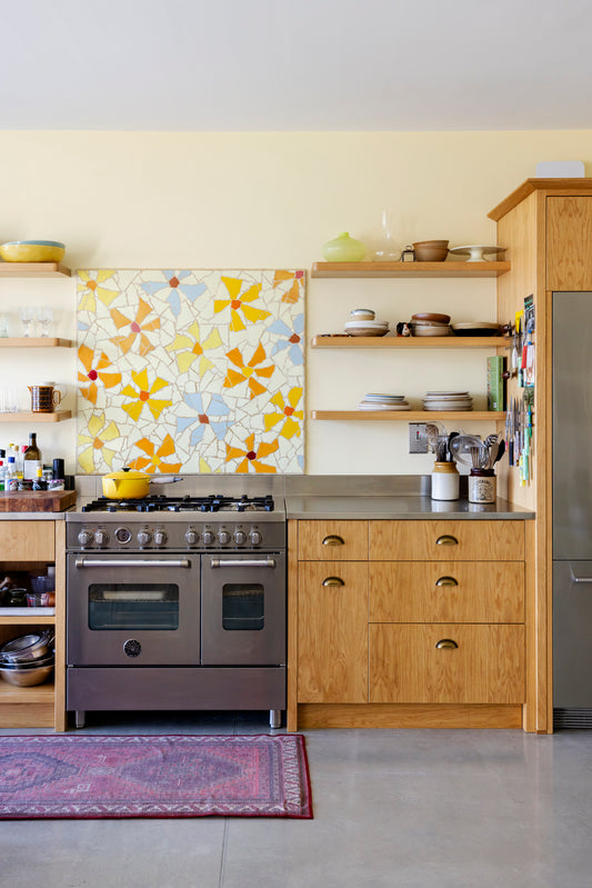 Max has chosen to feature this soothing neutral in his kitchen and dining area - a true reflection of his passion for cooking. The shade is beautifully complemented by wooden cabinetry, open shelving, and a characterful flower-inspired splashback.